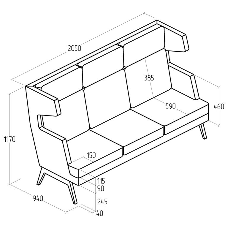 Прочный каркас из ДСП, ДВП и древесного бруса гарантирует надёжность, а опоры из массива дерева в оттенке тёмного дерева добавляют естественности и лёгкости внешнему виду. Механизм трансформации не предусмотрен, что делает конструкцию устойчивой и долговечной — это надёжный стационарный диван для офиса, рассчитанный на интенсивное использование.