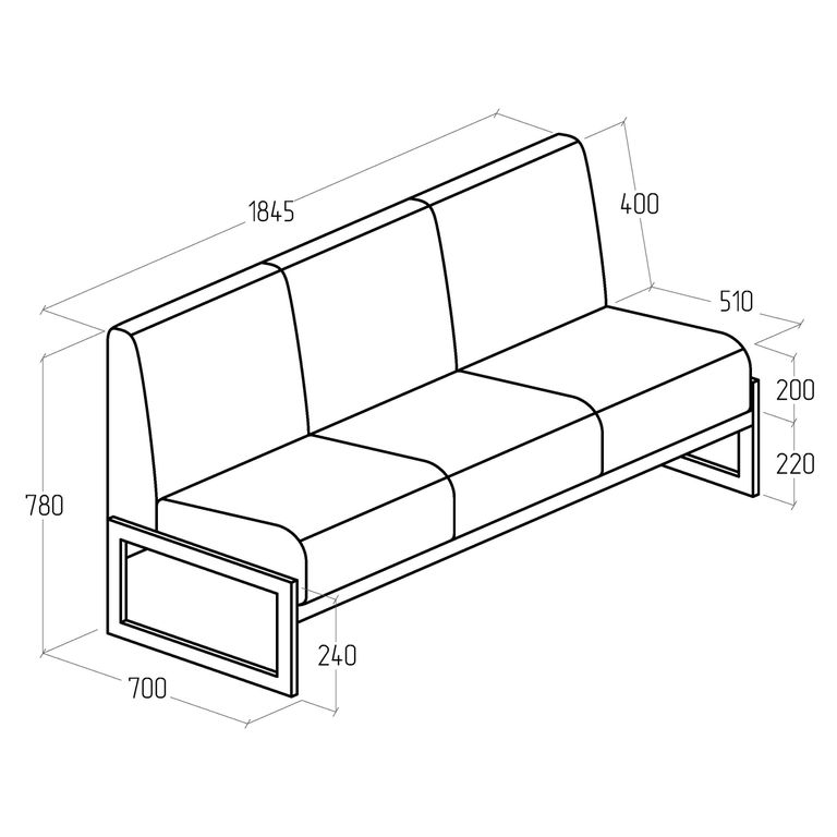 Размеры дивана — 1845 мм в длину и 700 мм в ширину, высота сиденья составляет 420 мм, что обеспечивает удобство при посадке и отдыхе.