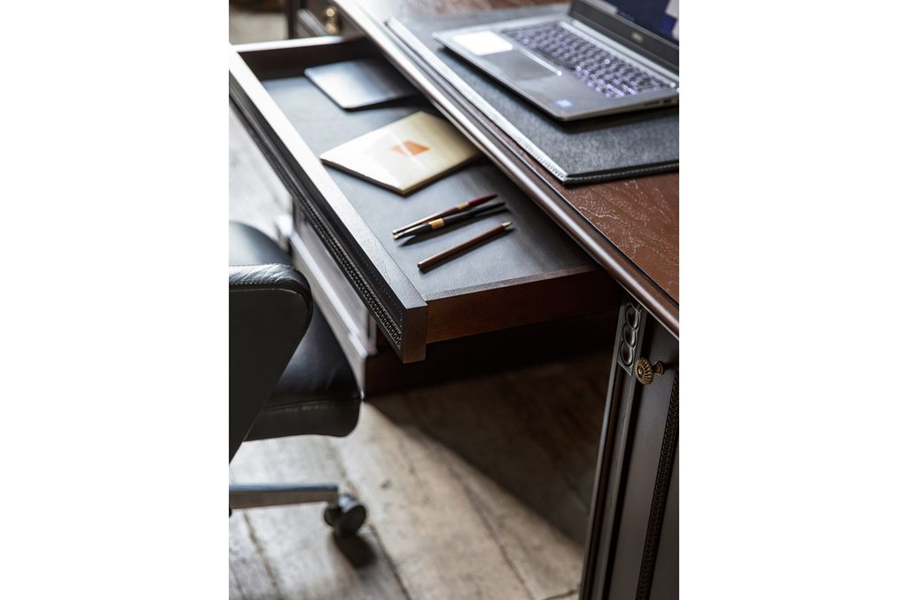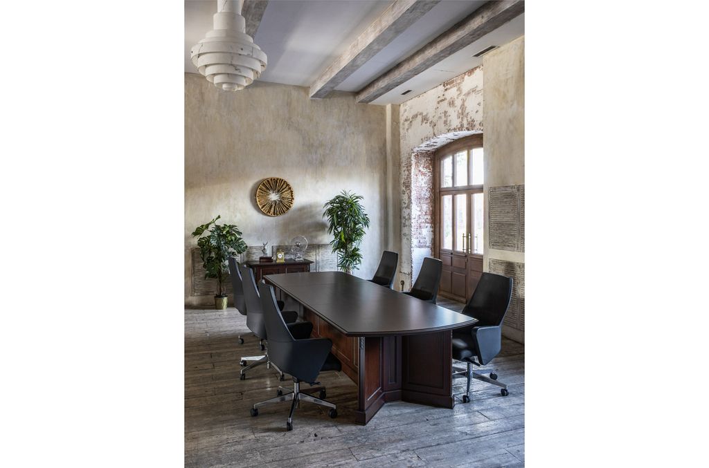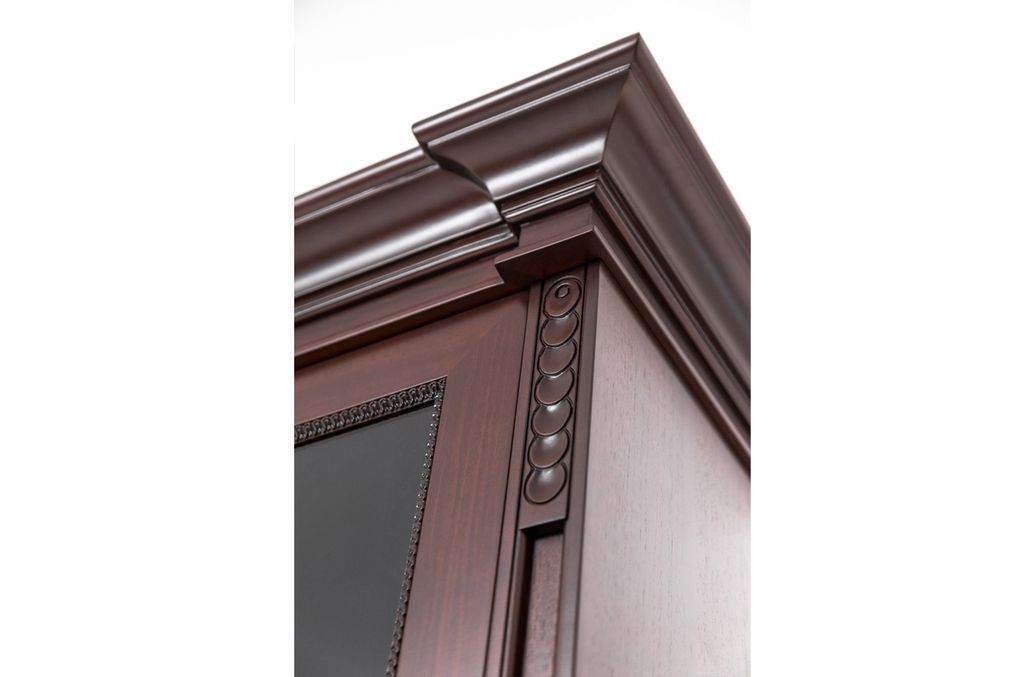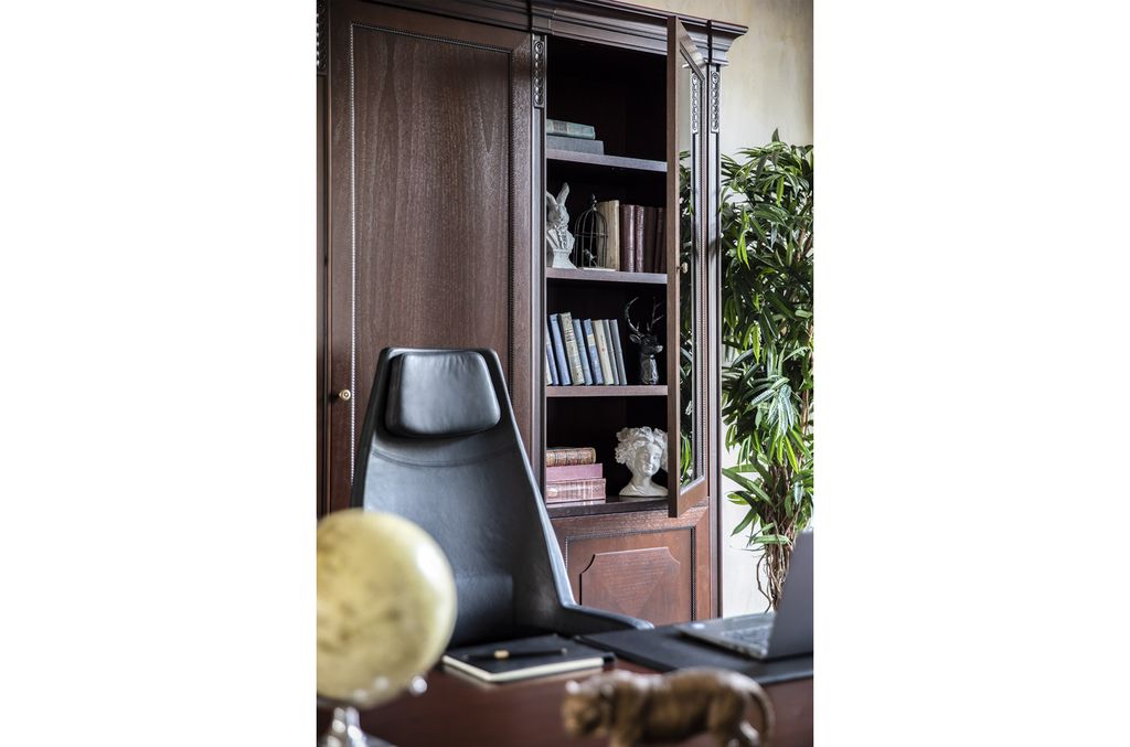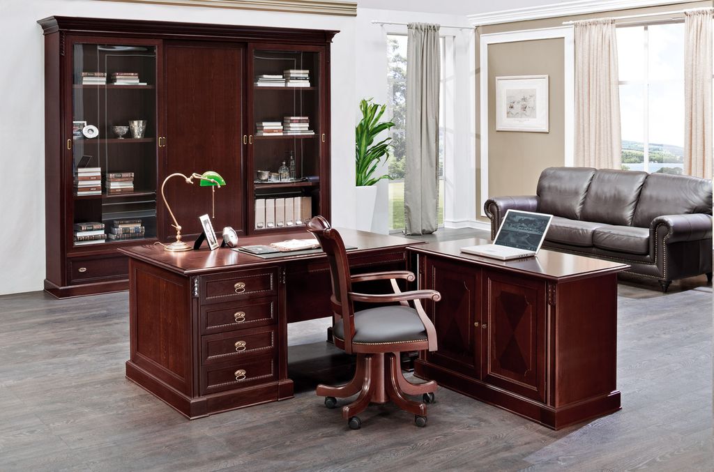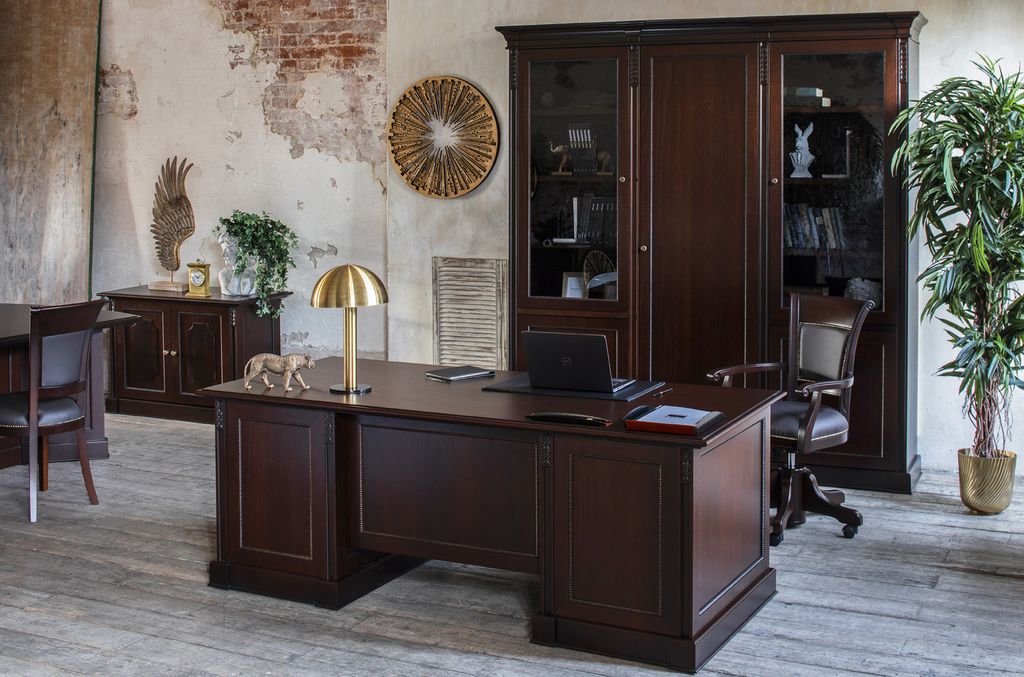 Теплая текстура натурального дерева создает в офисе благоустроенность, а глубокий цвет ореха Танганьика и рельефная резьба делают интерьер похожим на кабинеты с богатой историей.