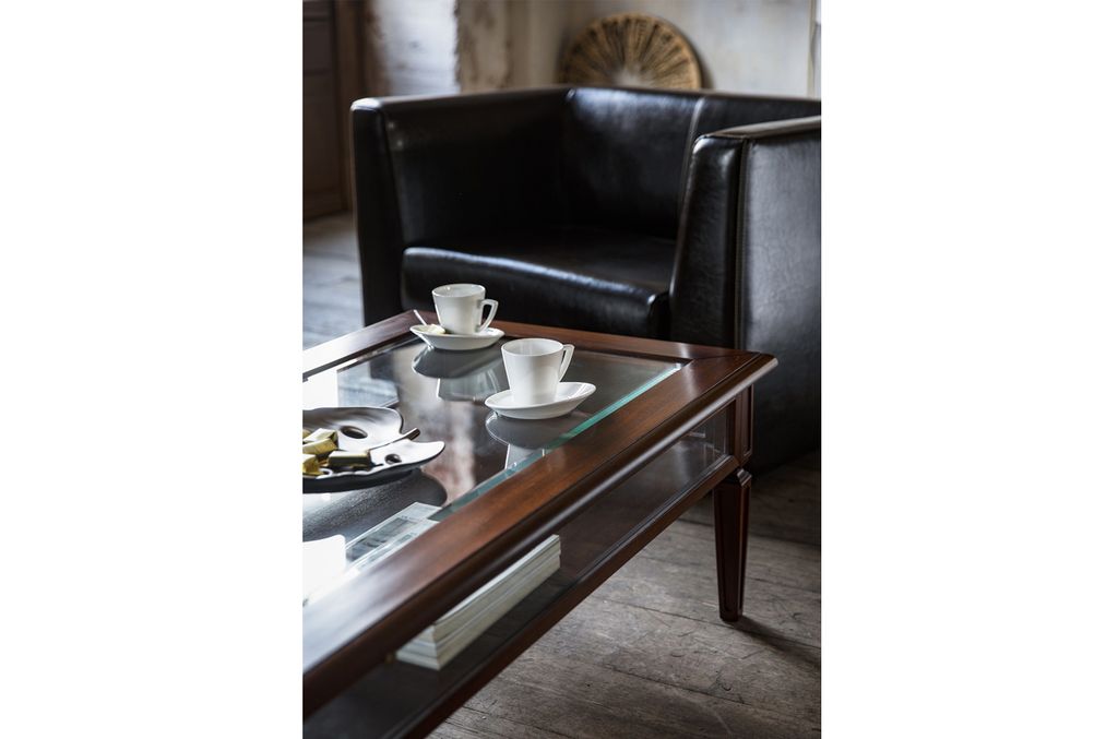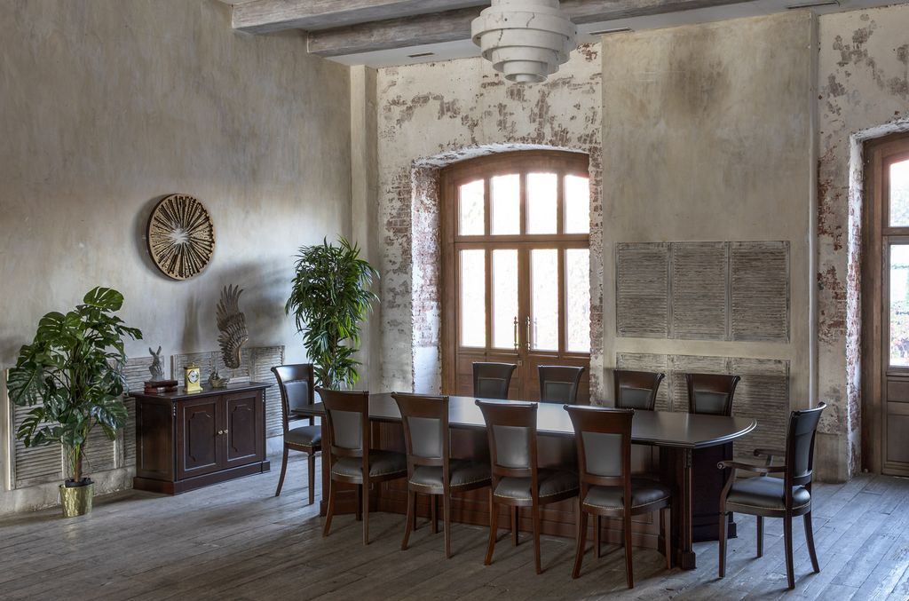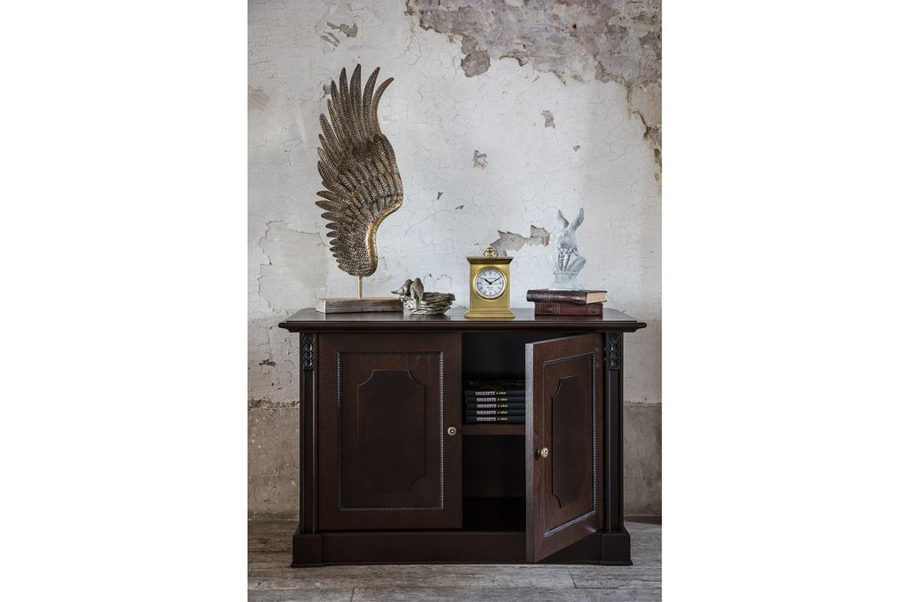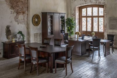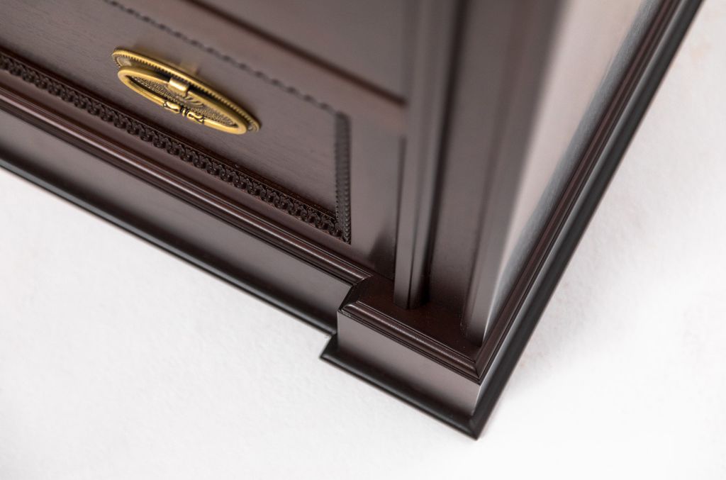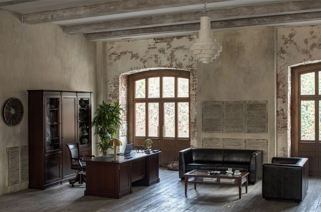 Теплая текстура натурального дерева создает в офисе благоустроенность, а глубокий цвет ореха Танганьика и рельефная резьба делают интерьер похожим на кабинеты с богатой историей.