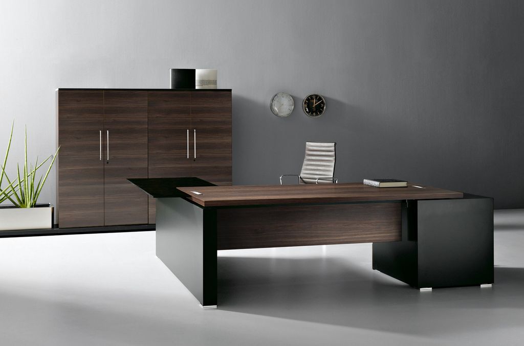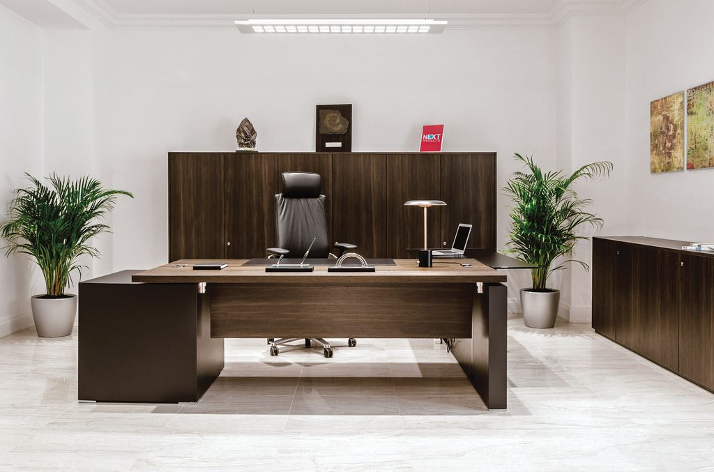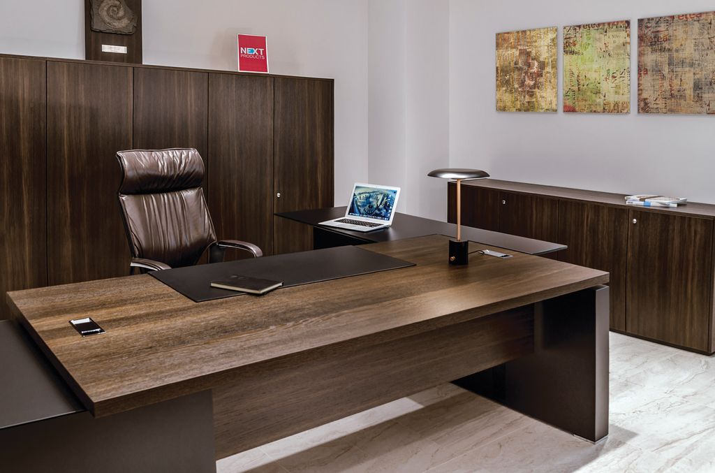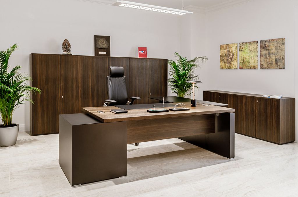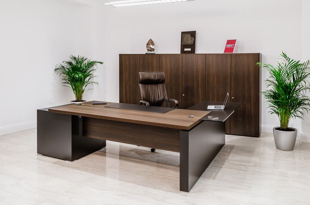 Технические элементы, необходимые для современного офиса, гармонично вписаны в дизайн кабинета. Шпонированная столешница, хромированные заглушки, элегантные опоры и опорные тумбы с кабель-каналами внутри.