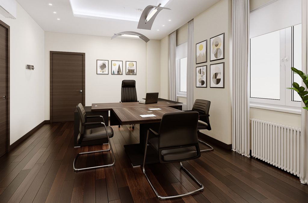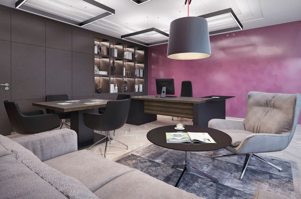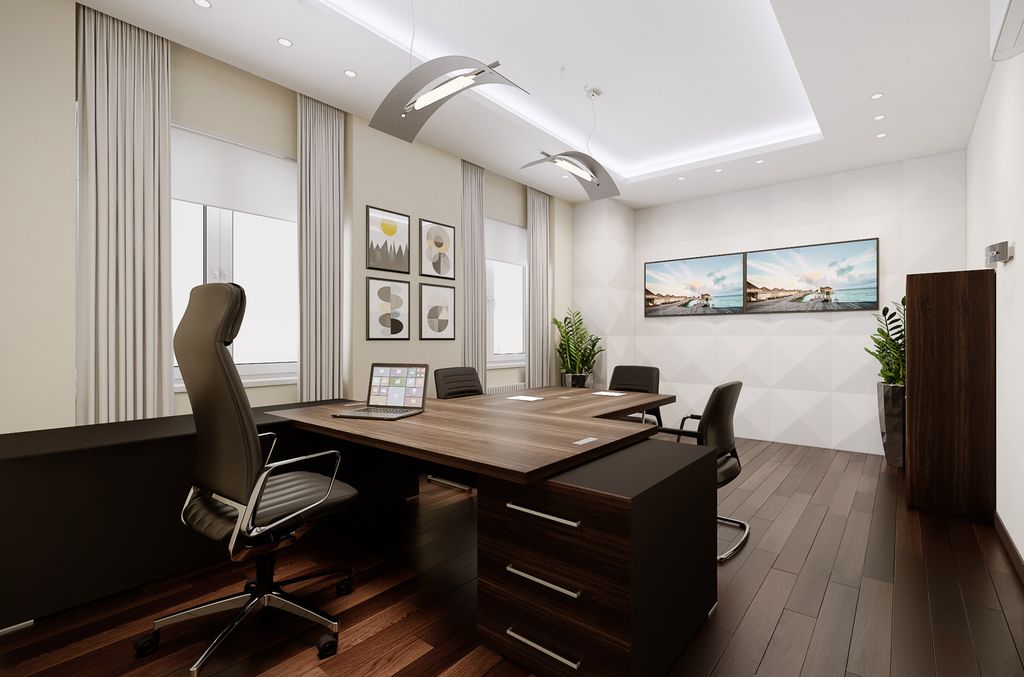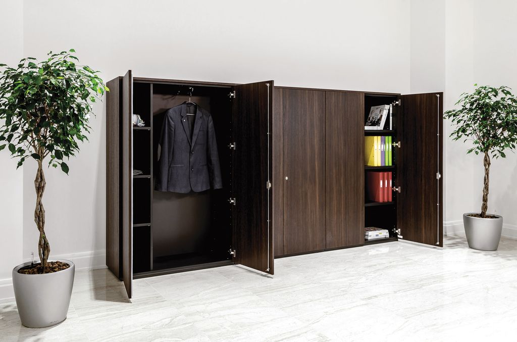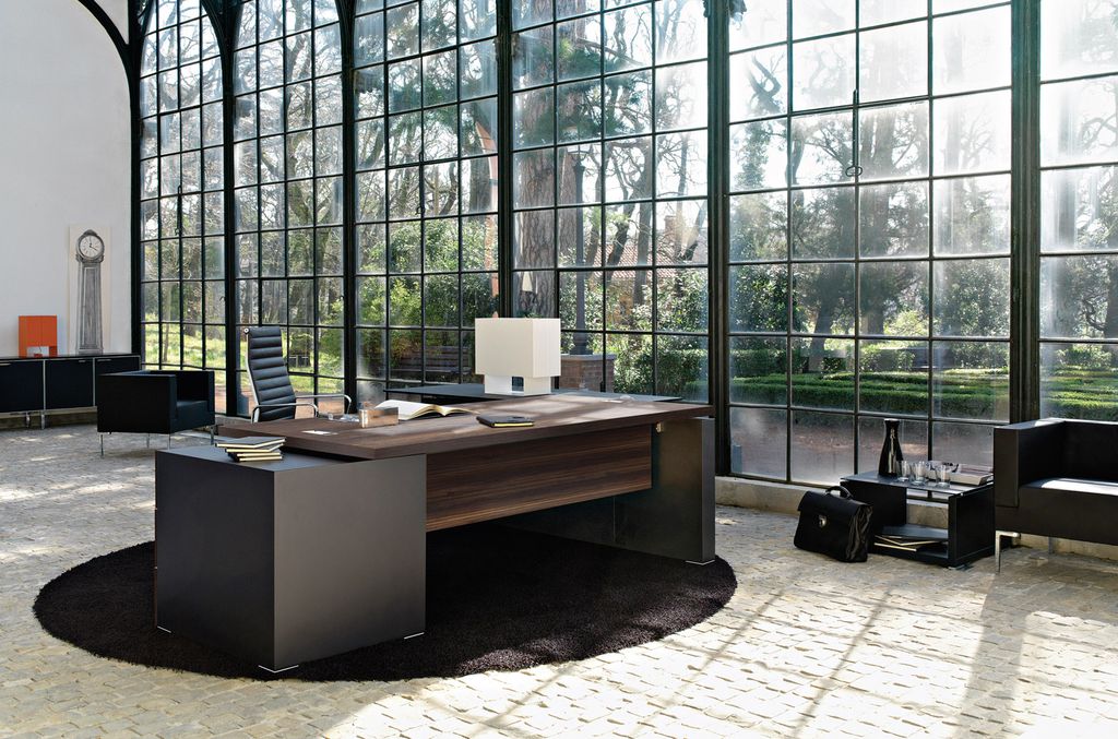 Технические элементы, необходимые для современного офиса, гармонично вписаны в дизайн кабинета. Шпонированная столешница, хромированные заглушки, элегантные опоры и опорные тумбы с кабель-каналами внутри.