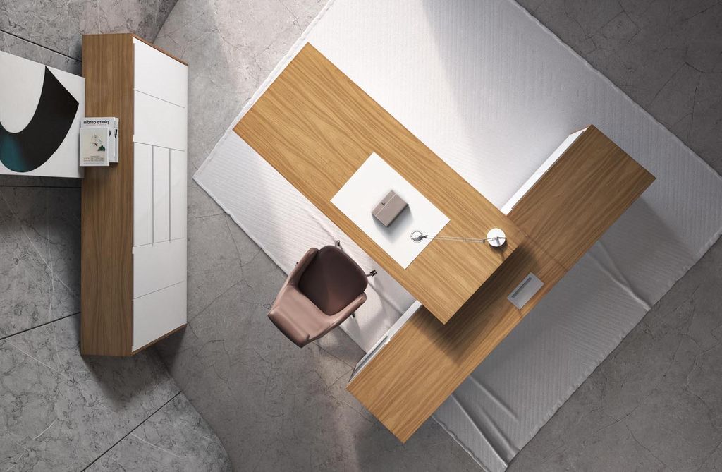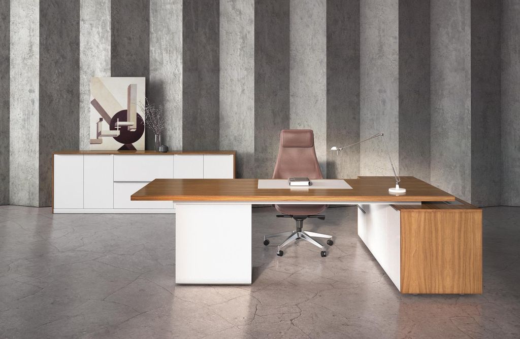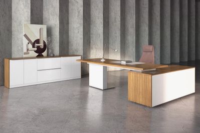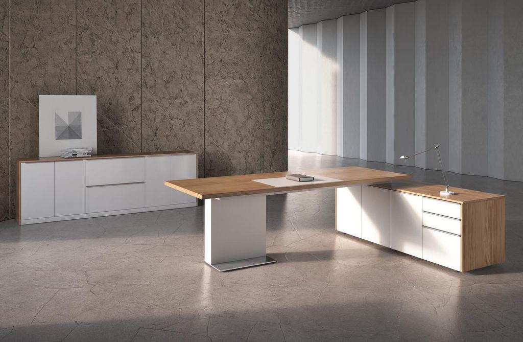 Письменный стол коллекции ALPINA станет истинной гордостью руководителя. Построенная на сопоставлении прямоугольных объемов, необычная форма стола подчеркивается сочетанием благородных материалов. Глубокого янтарного оттенка шпонированные поверхности оттеняются нежно-белым цветом покраски на фасадах тумб и шкафов и опоре стола.