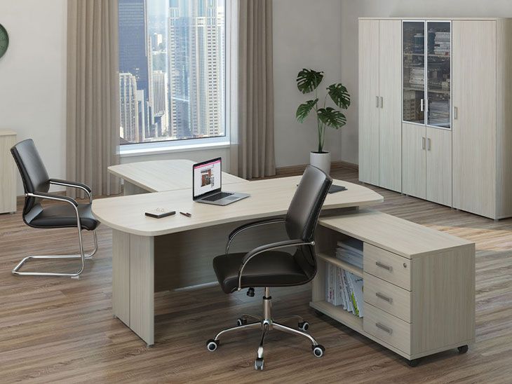 Кабинет руководителя Bonn — это стильное и функциональное решение для офиса. Он выполнен из качественного ЛДСП, что обеспечивает прочность и долговечность мебели. Столешницы толщиной 32 мм, топы тумб и шкафов толщиной 22 мм, каркасы и фасады толщиной 16 мм, опоры столов толщиной 32 мм — всё это гарантирует надёжность и устойчивость мебели. Кромка топов выполнена из ПВХ, что защищает края от повреждений и придаёт изделию завершённый вид. Верхний ящик тумб оснащён замком, что позволяет хранить важные документы и личные вещи в безопасности. Гарантия составляет 18 месяцев.