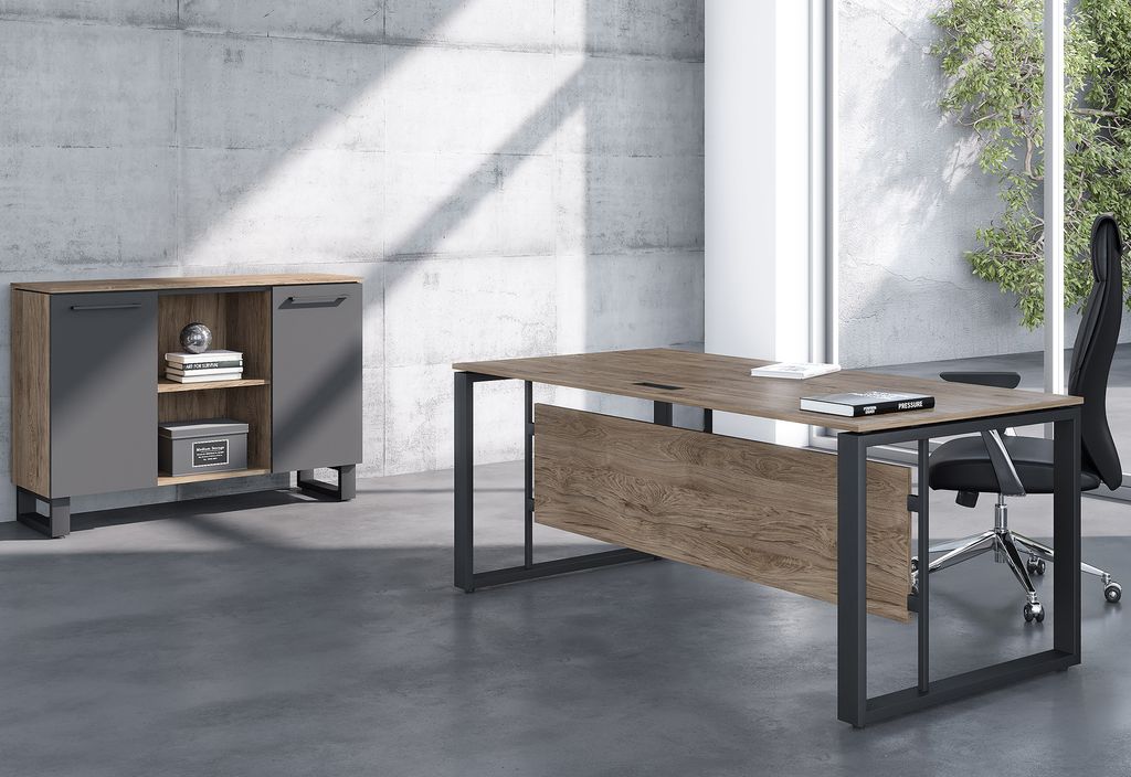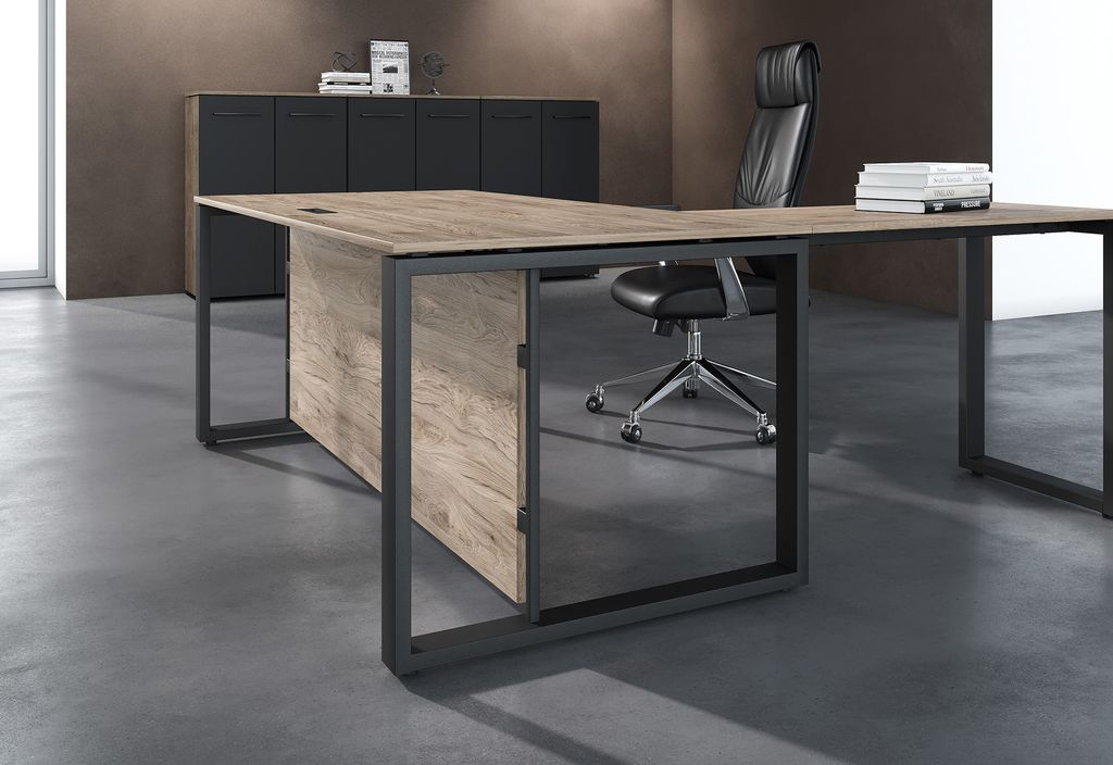 Тонкая игра нюансов в дизайне ENIO придает кабинету особый дух и уникальность. Массивные металлические опоры, дополненные "парящими" столешницами и фронтальными панелями, создают впечатление легкости и открытого пространства. Строгость и лаконичность крупных деталей в антрацитовом цвете прекрасно сочетаются с богатством древесного декора "Кария Пальмира".