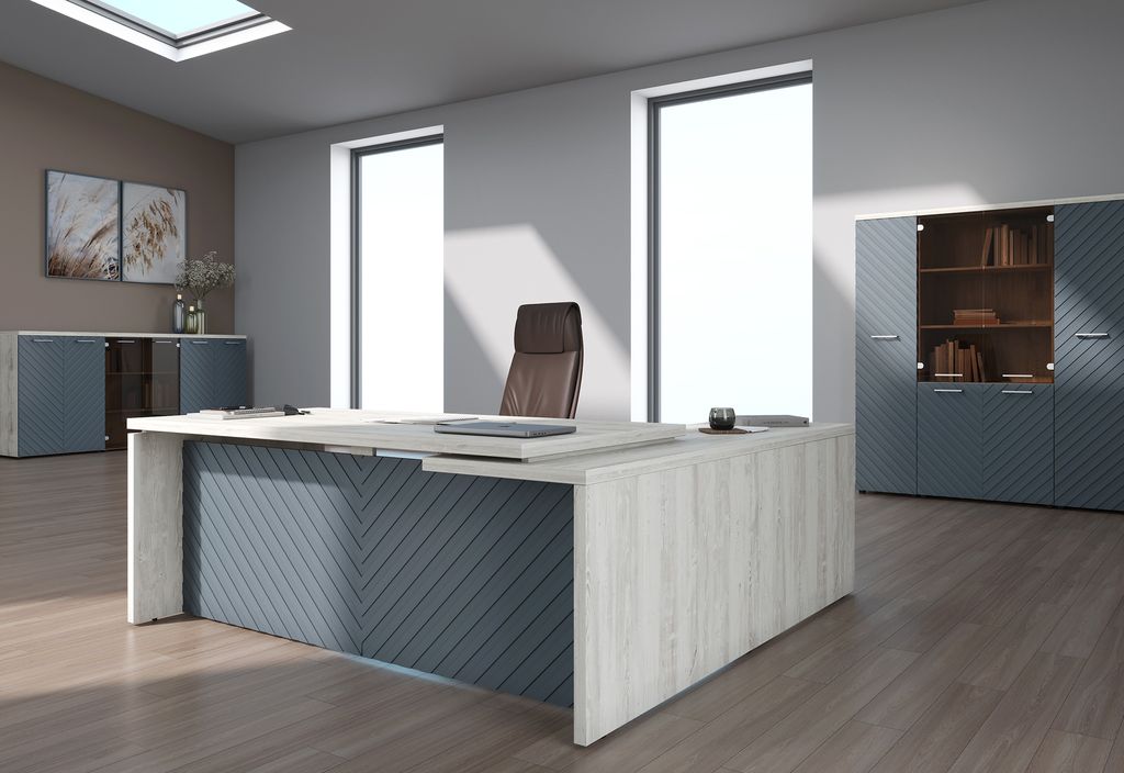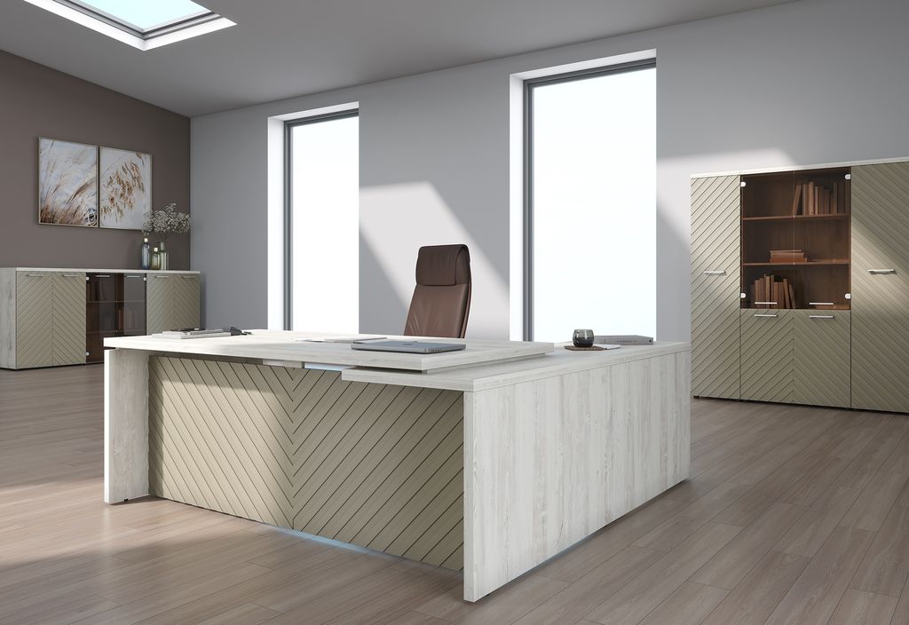 Кабинет бизнес-класса, сочетающий в себе эффектную и нестандартную фрезеровку, древесные декоры и самые современные оттенки эмали. Нестандартная фрезеровка в виде диагональных линий создает динамику и способна преобразить любое пространство. 4 оттенка эмали на любой вкус. Красный – для самых смелых! Цвет не останется незамеченным. Латте – идеальный оттенок белого. Безупречно сочетается с любыми натуральными оттенками. Капучино – современный приглушенный бежевый оттенок. Идеальный выбор для тех, кто любит спокойные, уютные дизайны. Серо-голубой - многогранный, чарующий оттенок, который в каждом сочетании выглядит по-новому.