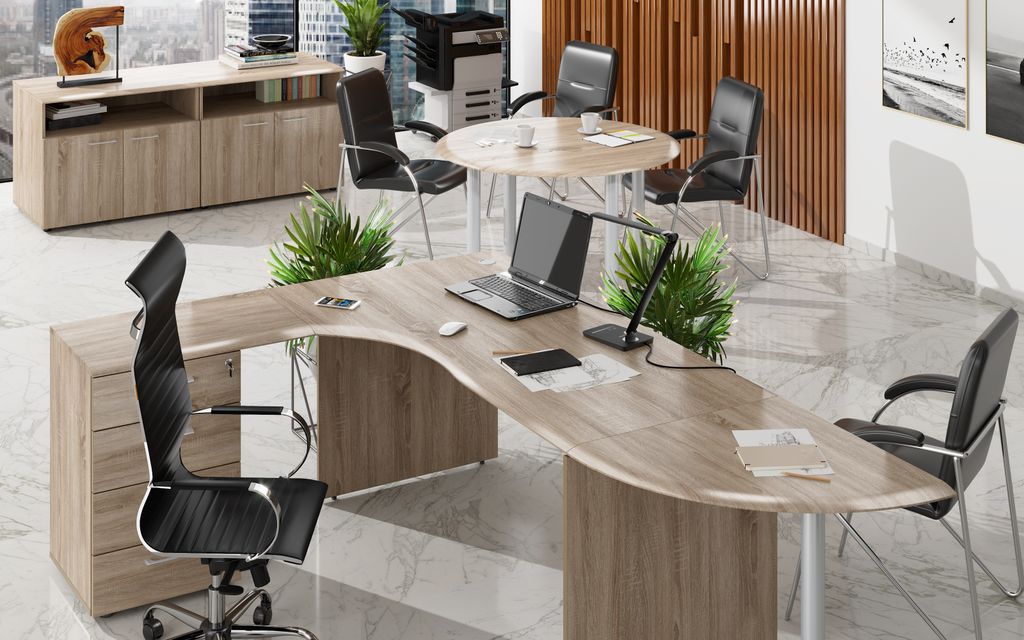 WAVE — это компактный кабинет руководителя, обеспечивающий организацию рабочего места с повышенной эргономикой. Рабочие поверхности выполнены из МДФ, облицованной пленкой ПВХ, что позволило сделать их края скошенными и плавными. Такие края обеспечивают самое комфортное положение рук при работе — и за компьютером, и с бумагами. Благодаря тонким проставкам между столешницами и опорами, создается эффект «парящей» столешницы, что делает мебель визуально лёгкой и технологичной. И, конечно, с помощью WAVE можно обставить не только кабинет руководителя, но и весь офис — в едином стиле и с самым высоким уровнем эргономики!