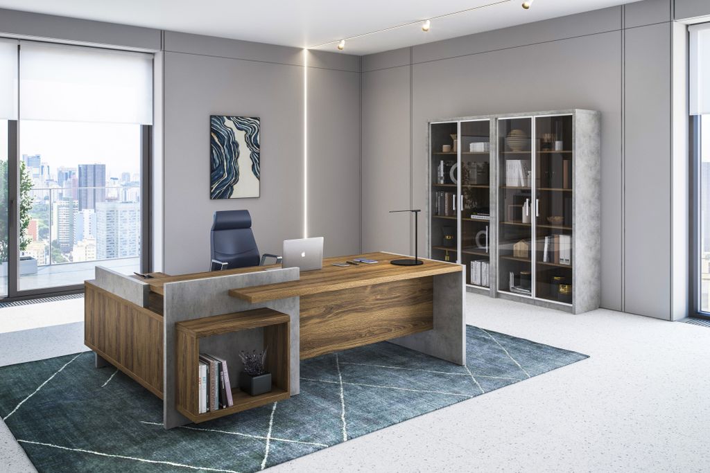 Кабинет руководителя Wood and Stone спроектирован для современного, уверенного в себе руководителя. Модельный ряд основных элементов и тщательно подобранное сочетание материалов создают для работы руководителя особый климат, где доминирует гармония формы и цвета. Благодаря применению в мебели материала со структурой натурального дерева, обстановка наполняется природной теплотой, помогая восстанавливать концентрацию. Кабинет руководителя WOOD&STONE разработан с учетом современных трендов в дизайне офисных пространств. Кабинет отличается сочетанием инновационных декоров под бетон и древесину, что позволяет его инсталлировать как в офисах с классическим, так и с индустриальным интерьером. В современных интерьерах используются индивидуальные, сложные фактуры материалов, как каждого в отдельности, так и в их коммуникации друг с другом в едином пространстве..