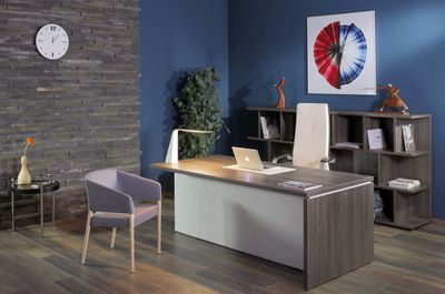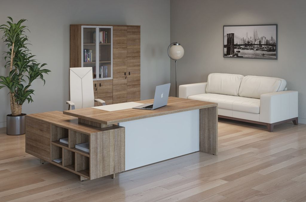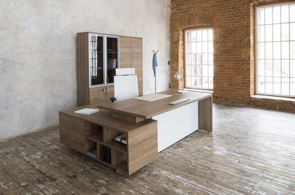 Terra — кабинет со стильным и выразительным дизайном. Скульптурные линии, теплые цвета в сочетании с натуральным рисунком дерева придают офису современный вид, яркие детали кабинета подчеркивают динамичный характер. В основе дизайнерского решения создание максимального комфорта пространства и функциональности офиса.