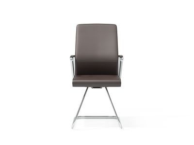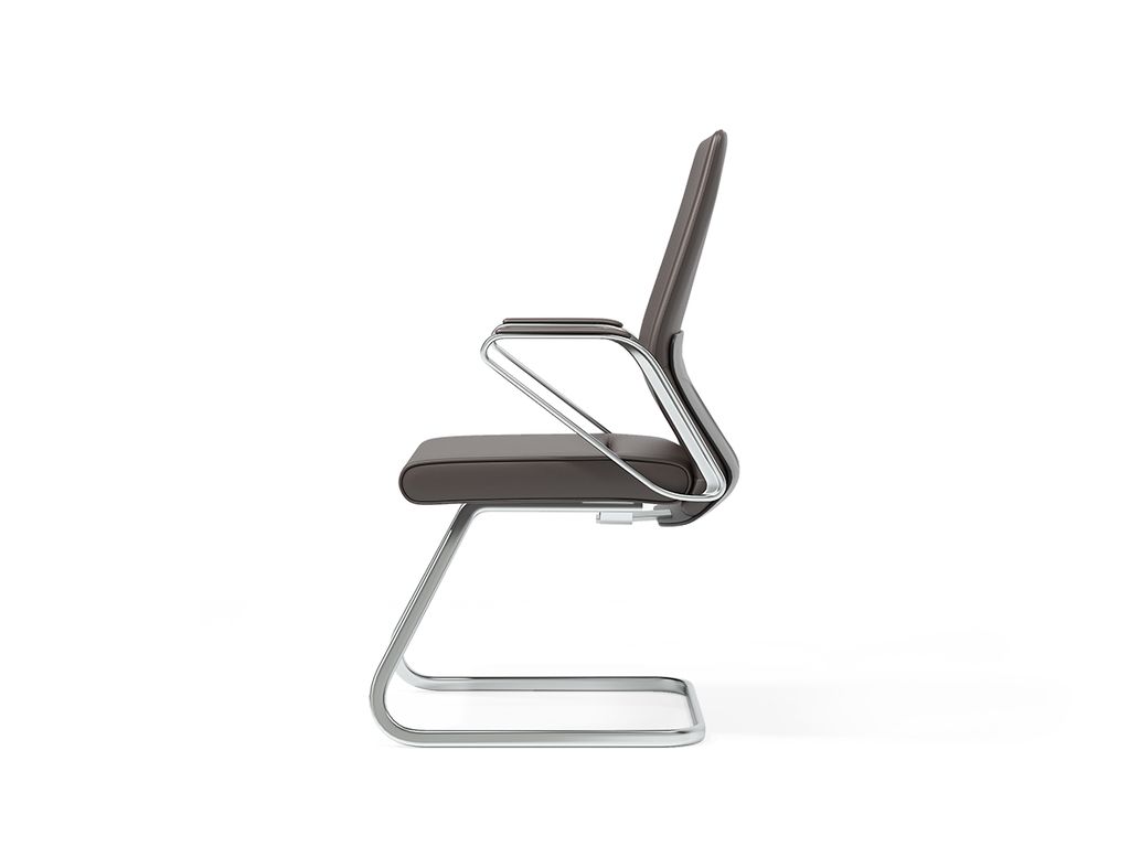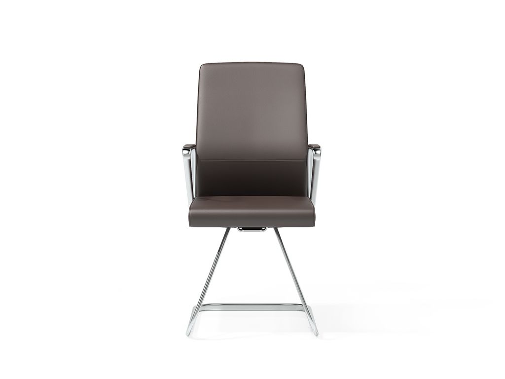 Переговорный стул на хромированных полозьях. Обивка спинки и сиденья - кожа с компаньоном, спинка тонкая. Подлокотники алюминиевые.