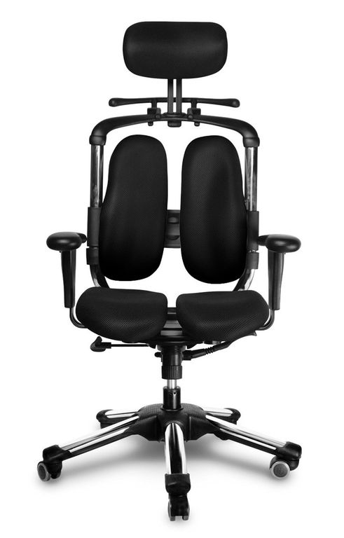 Запатентованное двойное сиденье. Спинка имеет две половинки которые регулируются по высоте и ширине. Ортопедическое кресло NIETZSCHE UD оборудовано синхромеханизмом качания с фиксацией любого положения. Вес пользователя до 120 кг.