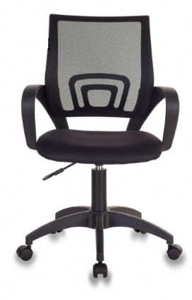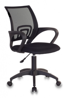Подлокотники из пластика со скругленными углами удобно поддерживают руки. Изделие можно фиксировать в рабочем положении с помощью рычага. Оно также регулируется по высоте и закреплено на пластиковой крестовине, размещенной на колесиках.