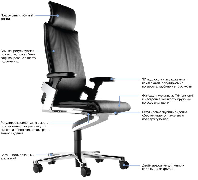 Кресло Wilkhahn ON Executive занимает место в десятке самых удобных в мире. Сиденье имеет регулировки по высоте и глубине, настройку жесткости пружины по весу сидящего. Боковые и вращательные движения спинки и сиденья контролируются двумя прочными изогнутыми пластинами, которые, находясь в движении независимо друг от друга, составляют основу синхро-механизма Trimension®. Работа пластин подобна деятельности суставов человека — минимальные изменения в весе сидящего безукоризненно отражаются на движении кресла, взаимодействие синхро-механизма, сиденья и спинки автоматически адаптирует кресло к каждой позе, в результате чего тело остается центром тяжести при любом характере движения сидящего. Кресло Wilkhahn ON Executive снабжено 3D подлокотниками, которые регулируются по высоте, глубине и в плоскости. Спинка кресла регулируется по высоте (до 6 см) без использования рычагов или кнопок и может фиксироваться в 6 положениях.