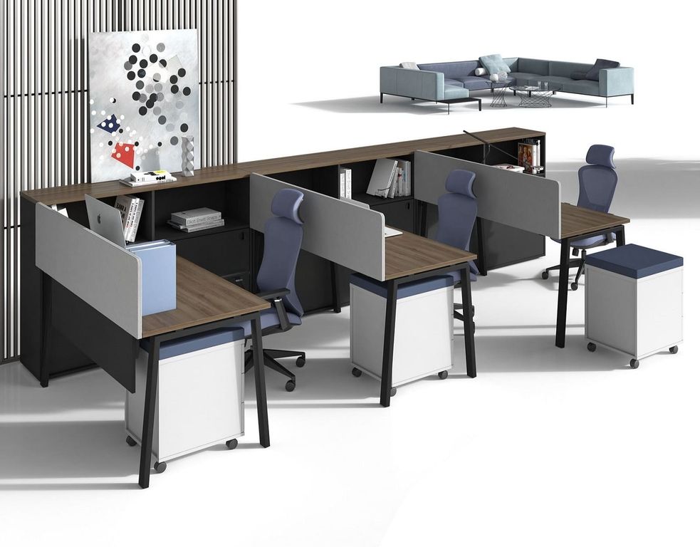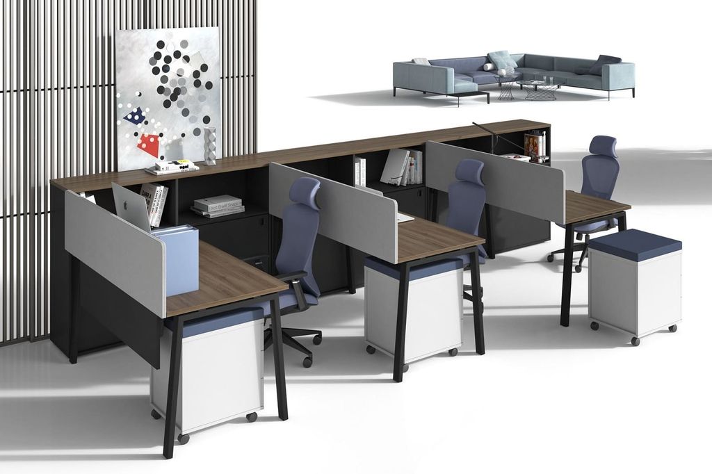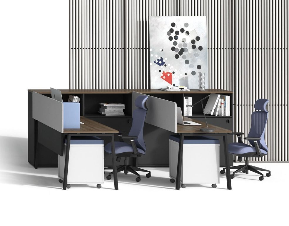 Модный цвет ЛДСП Салтилло прекрасно гармонирует с Антрацитовым цветом металлических опор сечением 60х30 мм. Белые тумбы придают композиции особую свежесть и динамизм, заряжая сотрудников энергией и позитивом. Приставные шкафы-купе, выполненные вровень с бенч-системой, расширяют рабочее пространство и служат для хранения документов. Фронтальные и торцевые тканевые экраны отделяют рабочие места, позволяя сосредоточится на важных задачах. О-образные опоры, обладая повышенной жесткостью конструкции и дизайнерским шиком придают мебели особый вид, заряжая офис энергией успеха. Экраны из дымчатого оргстекла на алюминиевом профиле усиливают это впечатление. Шкафы-купе высотой 101 см выполняют функции перегородок, отделяя рабочие места сотрудников от остального пространства офиса и систем хранения, использование которых обеспечивает легкий доступ к необходимой документации.