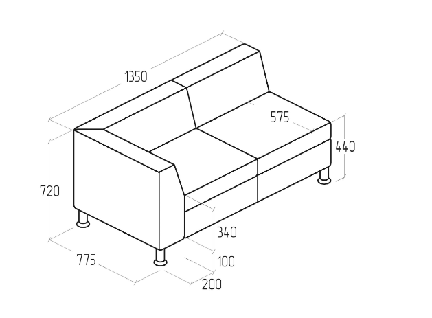 Габариты изделия составляют двухместный модуль 1350х775 мм при высоте 720 мм и высоте сиденья 440 мм. Глубина 575 мм обеспечивает комфортную посадку, а длина 1350 мм позволяет удобно разместить двух человек, при этом модуль не перегружает пространство и легко вписывается даже в компактные помещения. Его можно использовать как самостоятельный диванчик или комбинировать с другими элементами серии Monro, соединяя их между собой с помощью креплений «Крокодил».