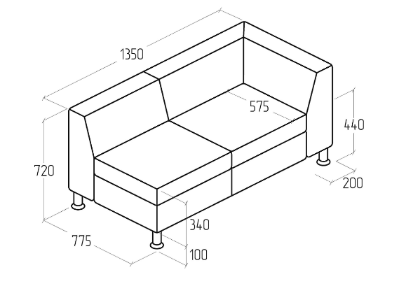 Габариты изделия составляют двухместный модуль 1350х775 мм при общей высоте 720 мм и высоте сиденья 440 мм. Глубина 575 мм создаёт удобную посадку, а оптимальная ширина позволяет размещать модуль как в небольших, так и просторных помещениях. Левый подлокотник делает модель удобной для установки в конце диванных линий или как самостоятельный элемент в интерьере.