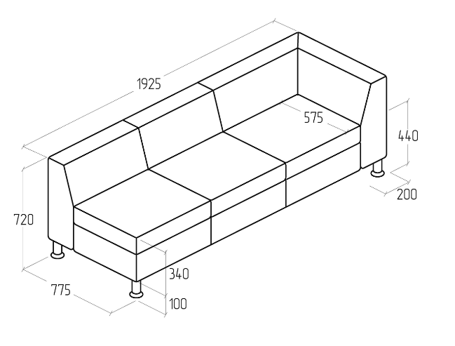 Хромированные металлические опоры высотой 100 мм придают модели современный внешний вид и облегчают уборку пространства. Общая ширина 1925 мм позволяет использовать модуль в качестве полноценного дивана в приемных, зонах ожидания и кабинетах руководства. Глубина сиденья 575 мм и высота 440 мм обеспечивают комфорт даже при длительном сидении.