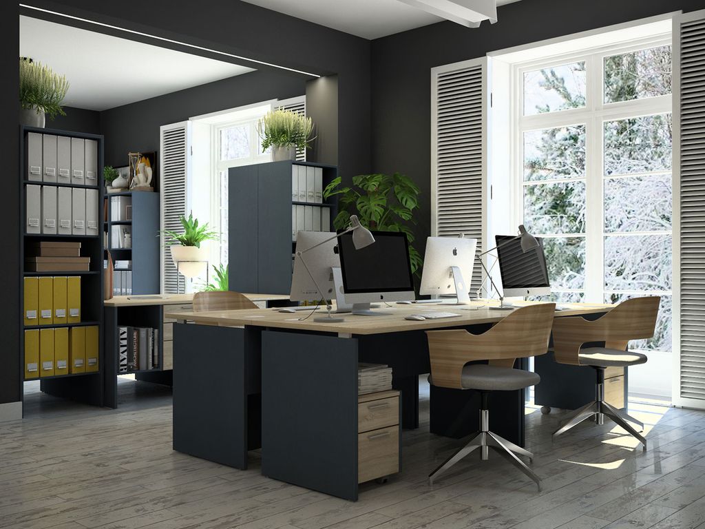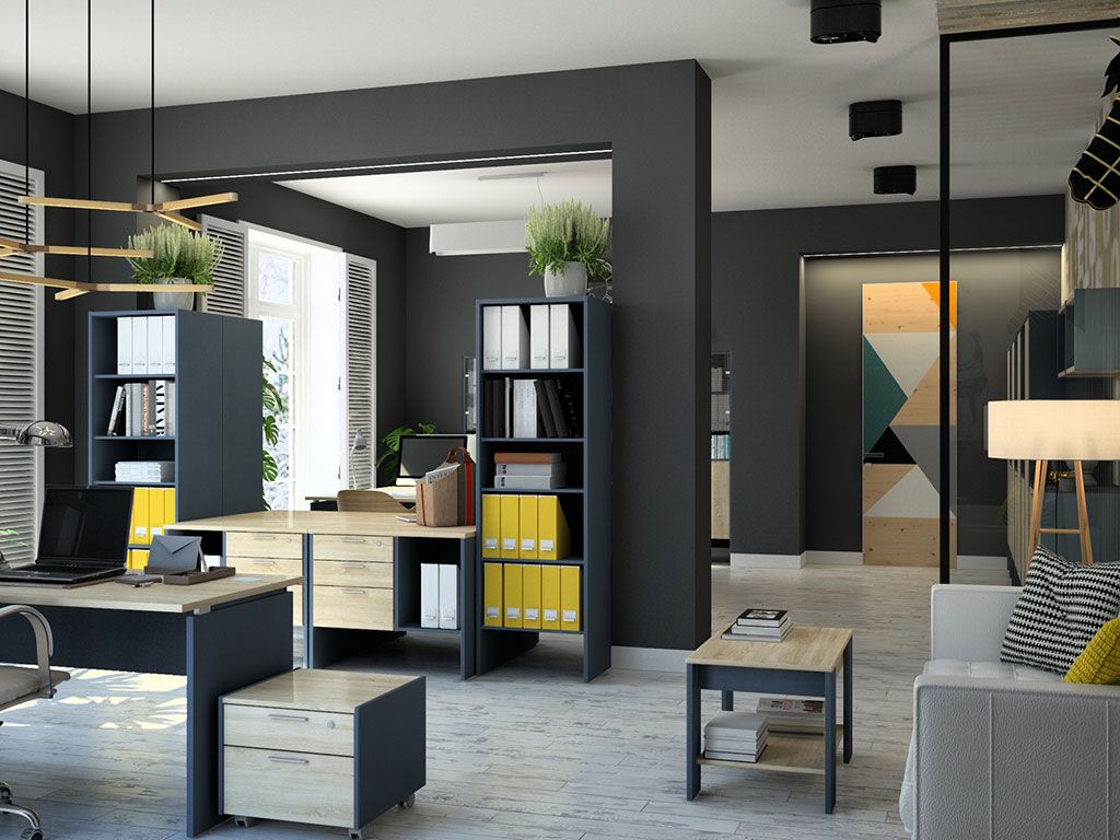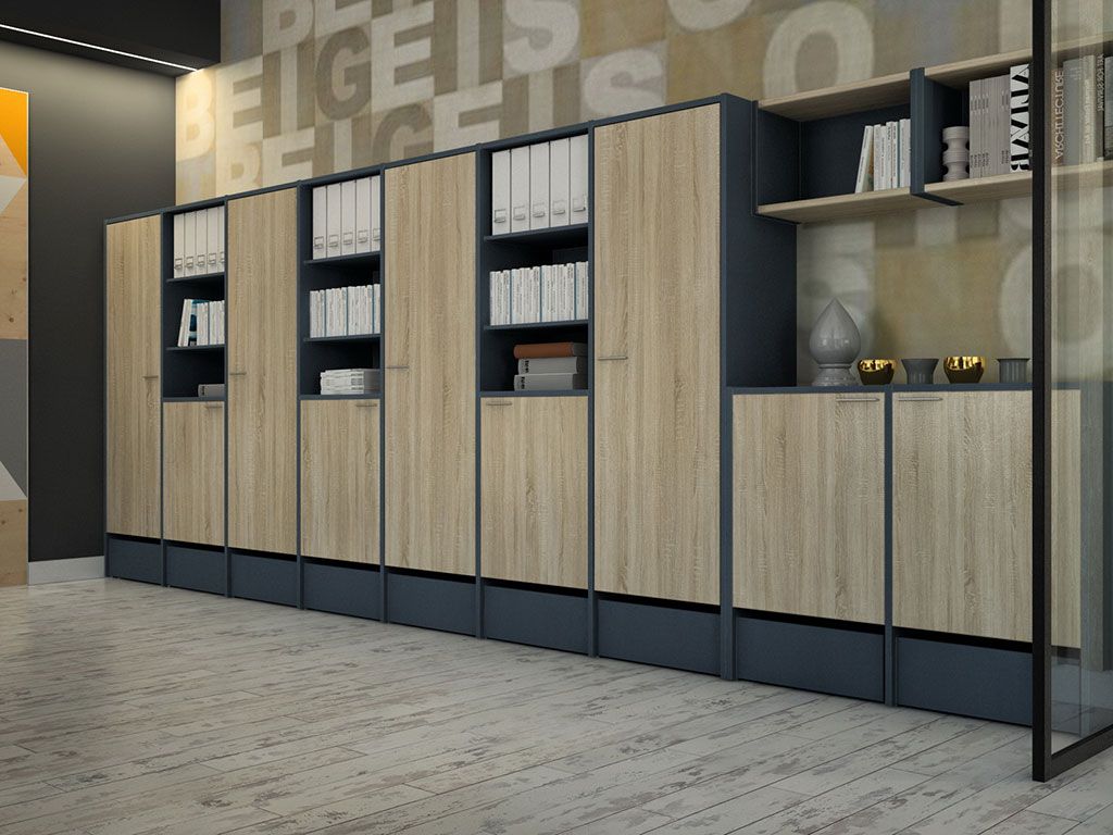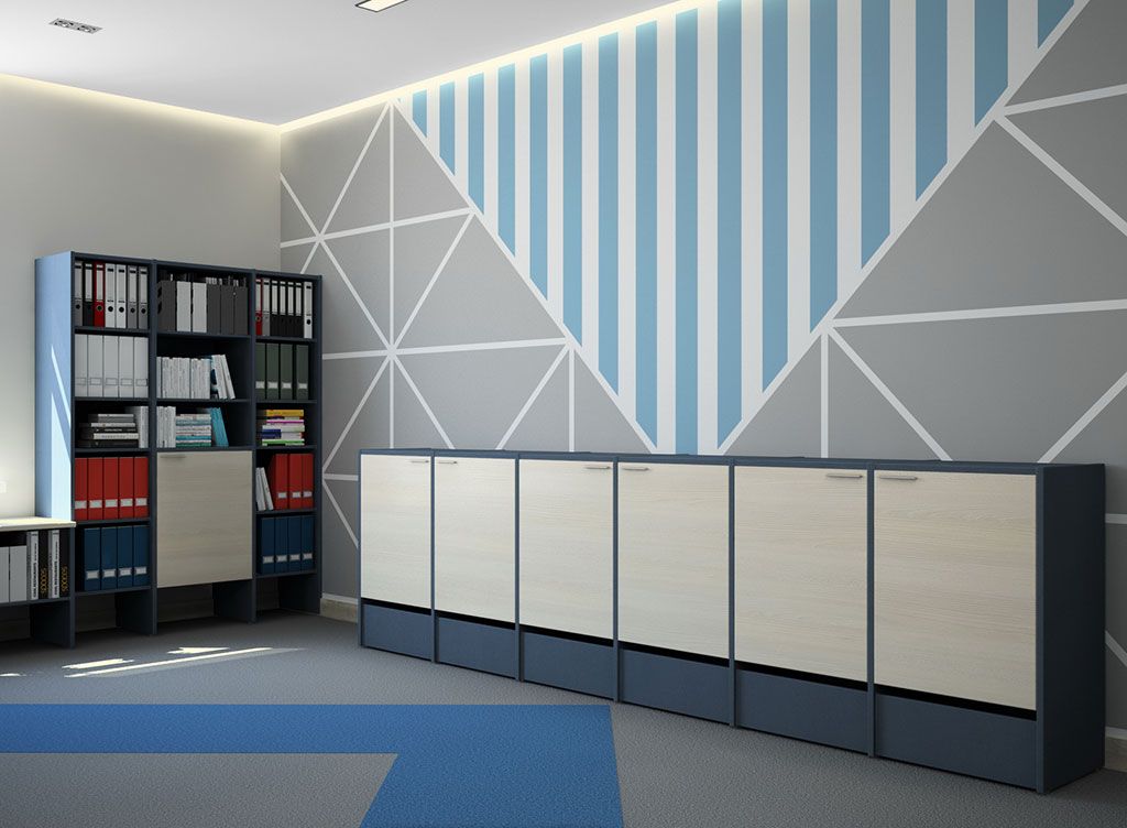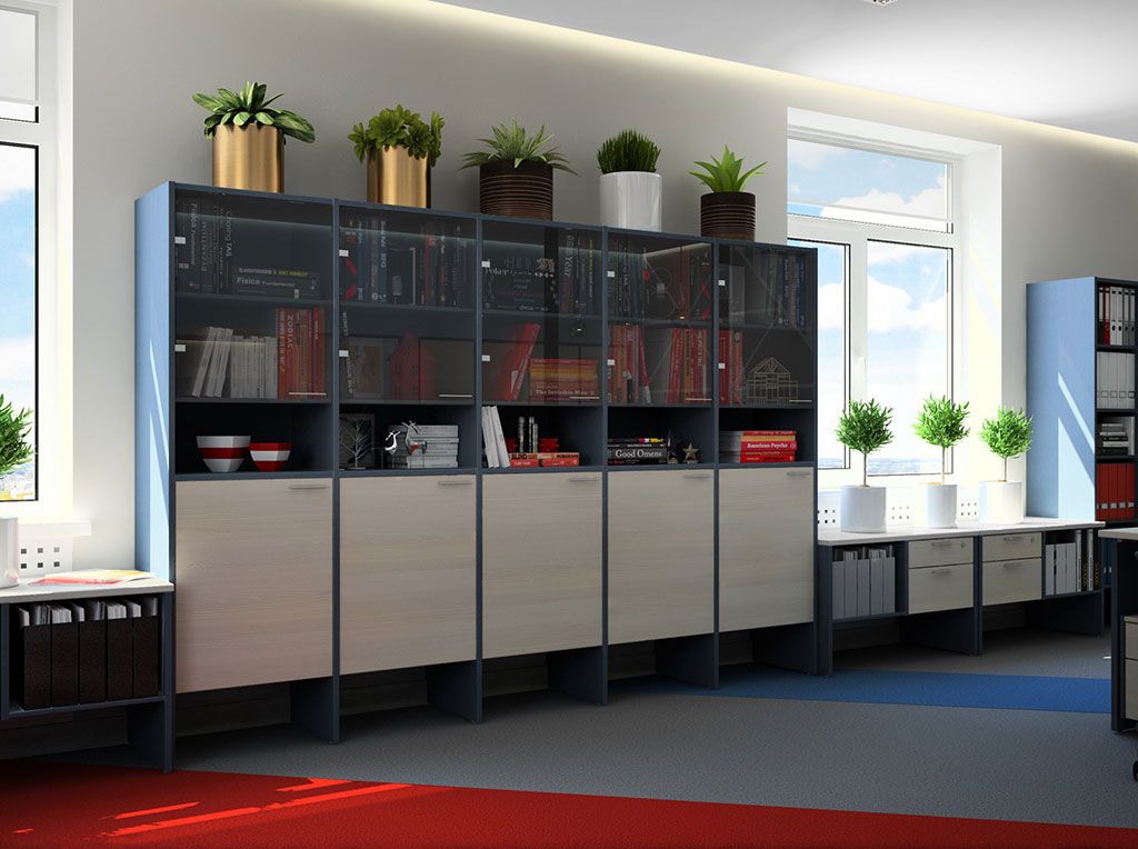 Офисная мебель для персонала Инновация. Основной элемент серии - модульная система шкафов, которые легко собираются и разбираются благодаря фурнитуре "быстрого монтажа". При сборке горизонталей используется принцип эксцентрика. Остальные полки устанавливаются на стяжки и благодаря клиновому эффекту притягиваются к боковой стенке, где надежно фиксируются. Модульная офисная система шкафов является конструктором, который собирается из отдельных элементов и их можно адаптировать под любой интерьер и геометрию комнаты. Такие шкафы можно переставлять с места на место и модернизировать за счет дополнительных модулей. Задняя стенка шкафов изготовлена из ЛДСП толщиной 8 мм, что позволяет использовать шкафы в качестве перегородок и разделить помещение на несколько зон.