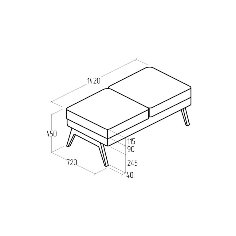 Благодаря увеличенной длине 1420 мм и глубине 720 мм модель может использоваться как двухместный пуф 1420х720, а также как компактная скамья у кровати, дополнительный модуль к дивану или стильный элемент прихожей. Высота 450 мм соответствует стандартной высоте сидений, поэтому пуф легко сочетать с другой мягкой мебелью.