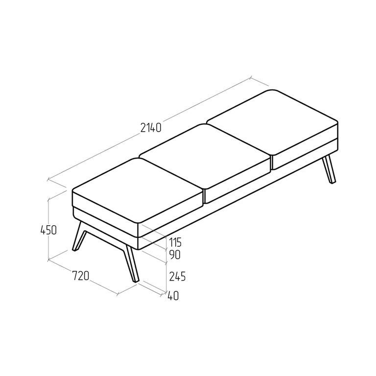 Каркас выполнен из ДСП, ДВП и деревянного бруса, что обеспечивает надёжность и устойчивость конструкции. Каждое посадочное место выдерживает нагрузку до 120 кг, поэтому пуф подходит даже для общественных пространств. Сиденье основано на многослойном наполнителе: ППУ марки S 3530, синтепоне 300 г/м² и аселекс 300. Благодаря этому модель обеспечивает упругую и в то же время комфортную посадку, не проседает и долго сохраняет форму — по наполнению это полноценный пуф с наполнителем ППУ S3530.