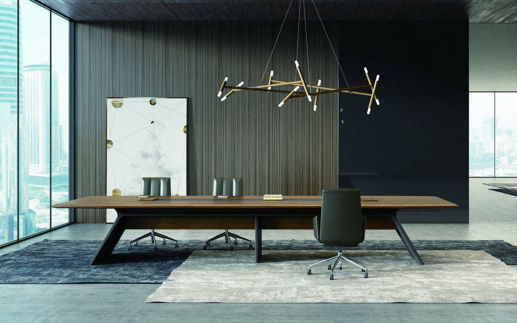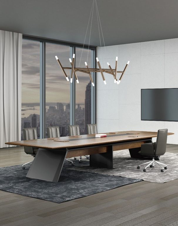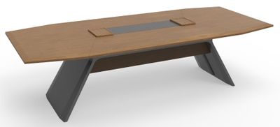 Стол переговорный. Материал МДФ класса Е0, 50 мм, с двухсторонней облицовкой из натурального шпона. Электрификация 2 блока проводов с подвижным деревянным лотком наверху, каждая из которых оснащена модулями 2 силовых, 1 CAT.6, 1 TEL, 1 HDMI и 1 магнитный блок проводки.
