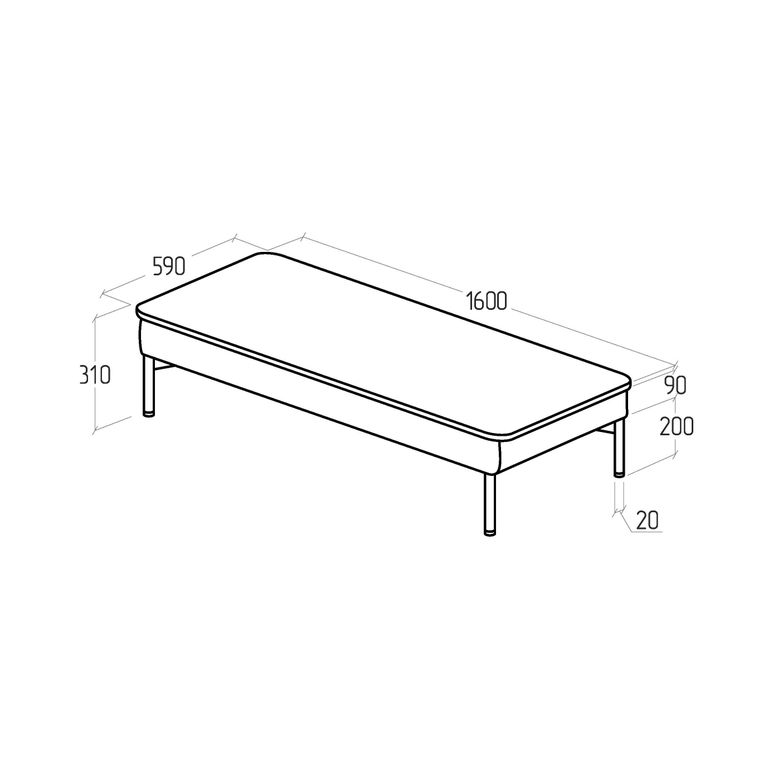 Металлические черные опоры высотой 20 мм придают конструкции устойчивость и современный вид, а размеры столика — 1600 мм в длину, 590 мм в ширину и 310 мм в высоту — делают его удобным для работы вдвоем или для организации пространства в переговорных и зонах отдыха.