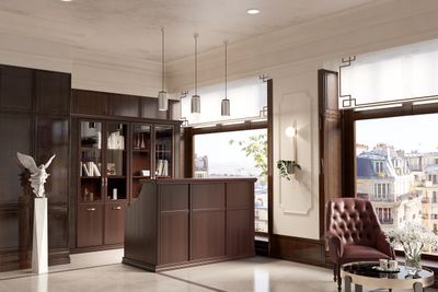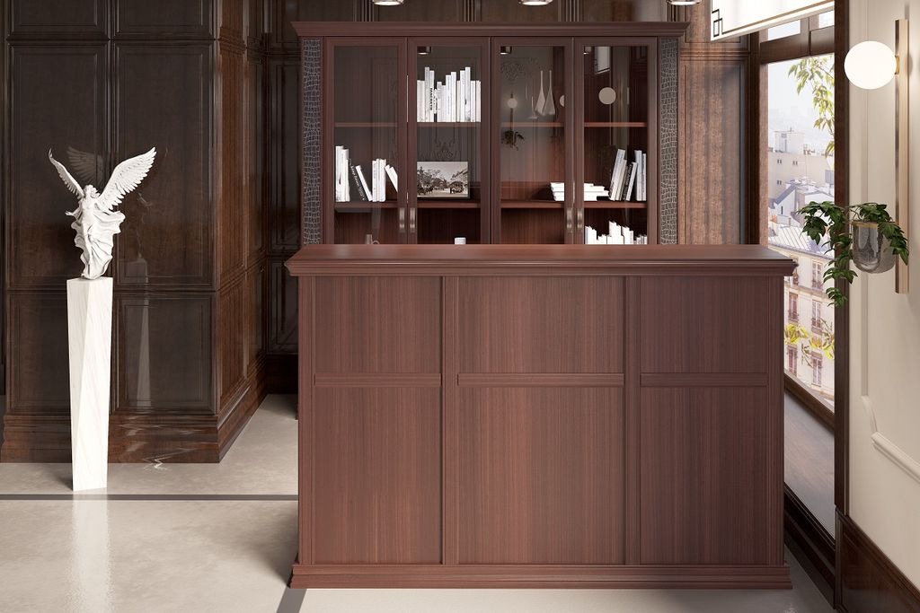 Стойка администратора Porto была создана итальянским дизайнером Marco Bortolin специально для экспозиции на выставке мебели, где этот кабинет был впервые представлен. Но она так понравилась посетителям, что ее решили включить в стандартный ассортимент. И не зря! Эти стойки администратора теперь устанавливают и в банках, и в SPA-салонах и в приемных руководителя. Итальянский дизайн, классический стиль, фигурные бордюры, карнизы и цоколи – всё это подчёркивает респектабельность компаний. Рекомендуем заказать с подвесной тумбой.
